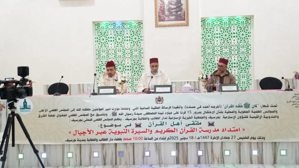 احتضنت مدينة جرسيف فعاليات ملتقى أهل القرآن، وذلك يوم الخميس 27 جمادى الآخرة 1447هـ الموافق لـ18 دجنبر 2025، بقاعة الحفلات بدار الطالب والطالبة. شهد الملتقى حضورًا رسميًا وازنًا، إلى جانب علماء وباحثين ومحفظين ومرشدين وطلبة من مختلف الأقاليم.