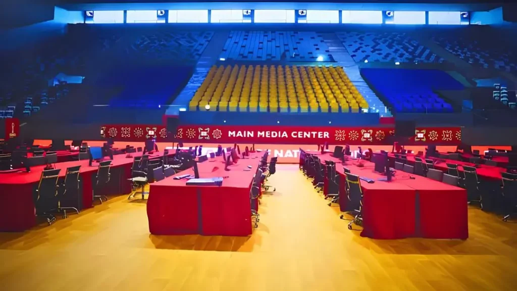 تبلغ الطاقة الاستيعابية للمركز حوالي 2000 شخص، وقد صُمّم لتلبية احتياجات مختلف أنواع وسائل الإعلام، بما في ذلك التلفزيون والإذاعة والصحافة المكتوبة والمصورين وصناع المحتوى، مع توفير بيئة عمل متكاملة تشمل اتصالات إنترنت عالية السرعة، ومكاتب عمل مريحة، ومرافق أخرى. الدخول إلى المركز مقتصر على وسائل الإعلام المعتمدة لتغطية البطولة.