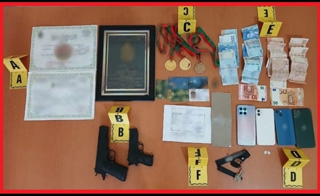 خلال التفتيش، عثرت المصالح الأمنية على مسدسات بلاستيكية وشارات مزورة، إضافة إلى مبالغ مالية بعملات مختلفة ووثائق بنكية وأجهزة هواتف، والتي تخضع حاليًا للخبرة التقنية.