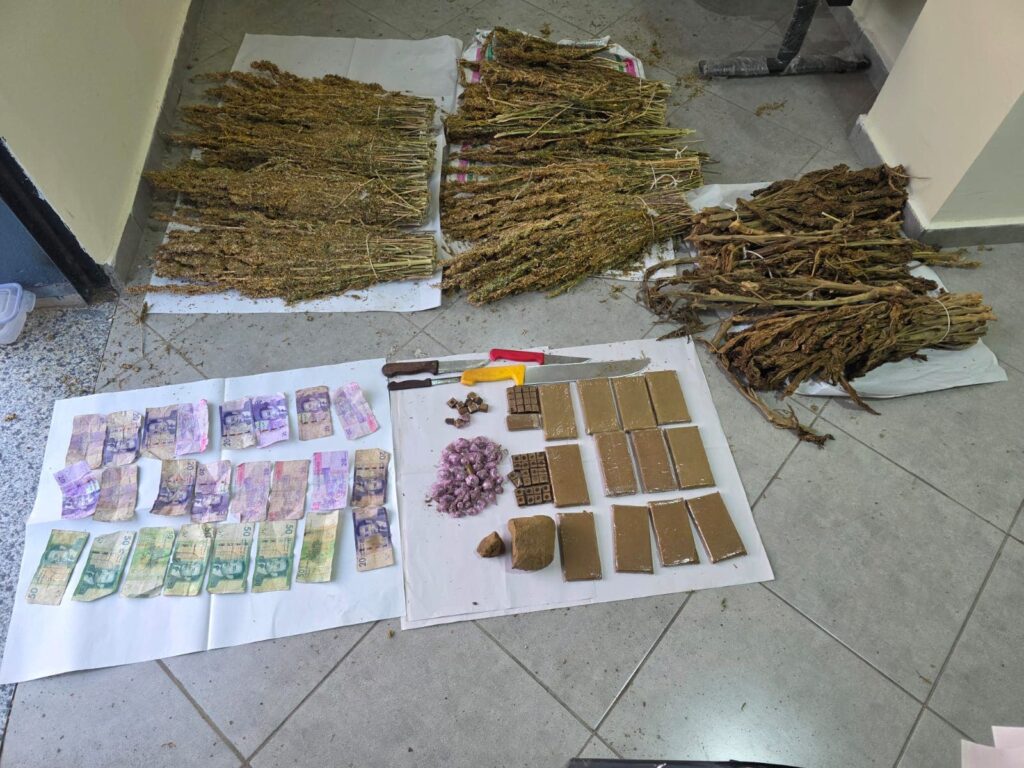 كما شملت المحجوزات 800 غرام من الحشيش، و20 كيلوغرام من سيقان القنب الهندي، و10 كيلوغرام من التبغ السائب، بالإضافة إلى مبلغ مالي قدره 1265 درهمًا، وسكينين، ودراجة نارية.