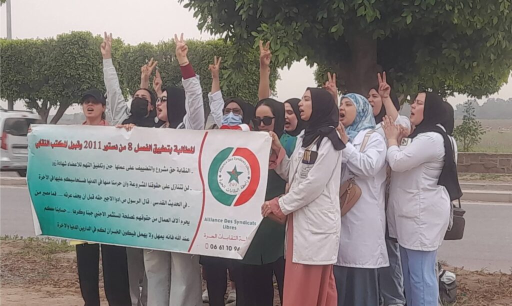ورفع المحتجون شعارات ولافتات تدعو إلى احترام الحق في العمل النقابي وتفعيل دستور 2011، وتحديدًا الفصل الثامن منه، الذي يضمن حرية الانخراط النقابي والدفاع عن المصالح المهنية.